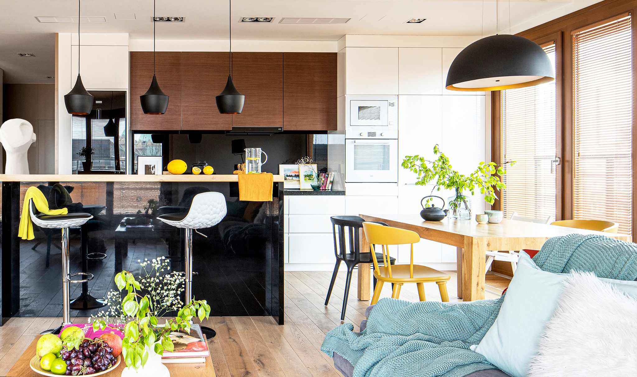Salon od kuchni w pierwotnym planie oddzielała ściana, która została usunięta a w jej miejsce powstała wyspa kuchenna z dwoma poziomami wysokości.