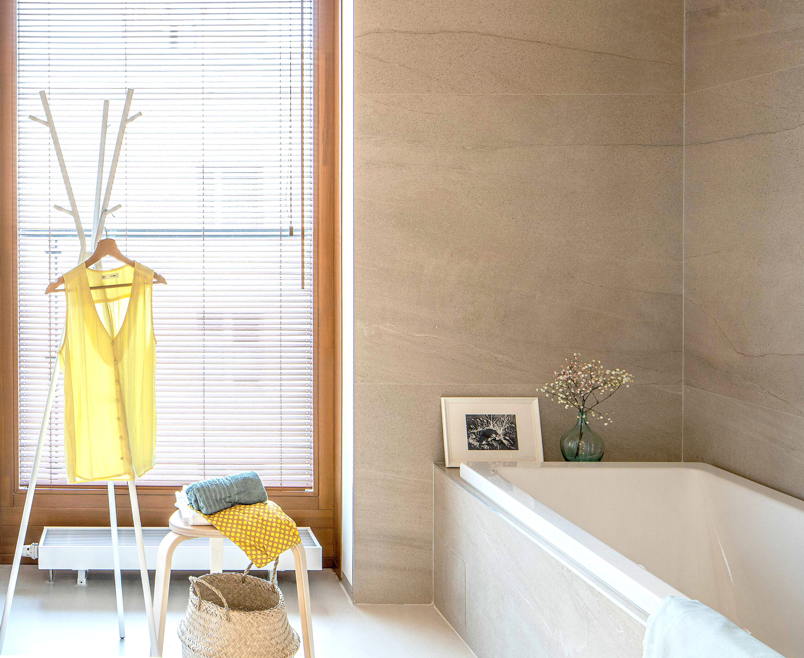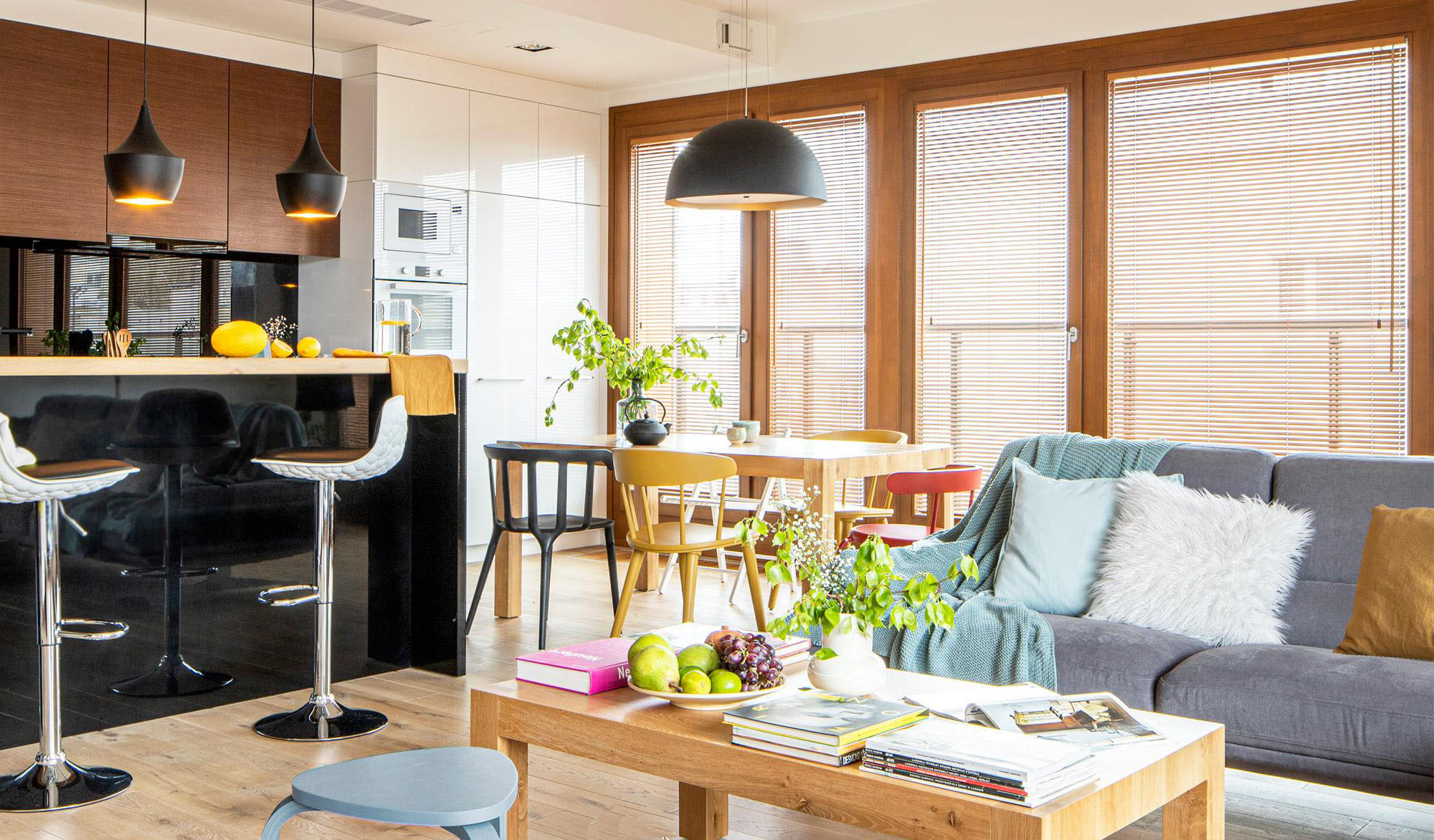 W prawie całym mieszkaniu przewija się baza kolorów: odcienie drewna, bieli, beżu, szarości oraz czerni. Do tej bazy dodane są akcenty kolorystyczne w postaci dodatków. Wnętrze mieszkania utrzymane jest w ciepłej stylistyce.